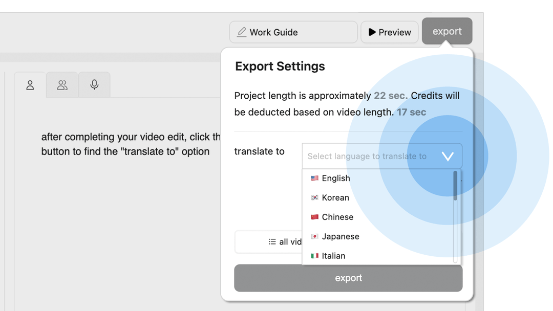 - Export: Click "Export" to start the translation. Processing time depends on video length and the number of selected languages.