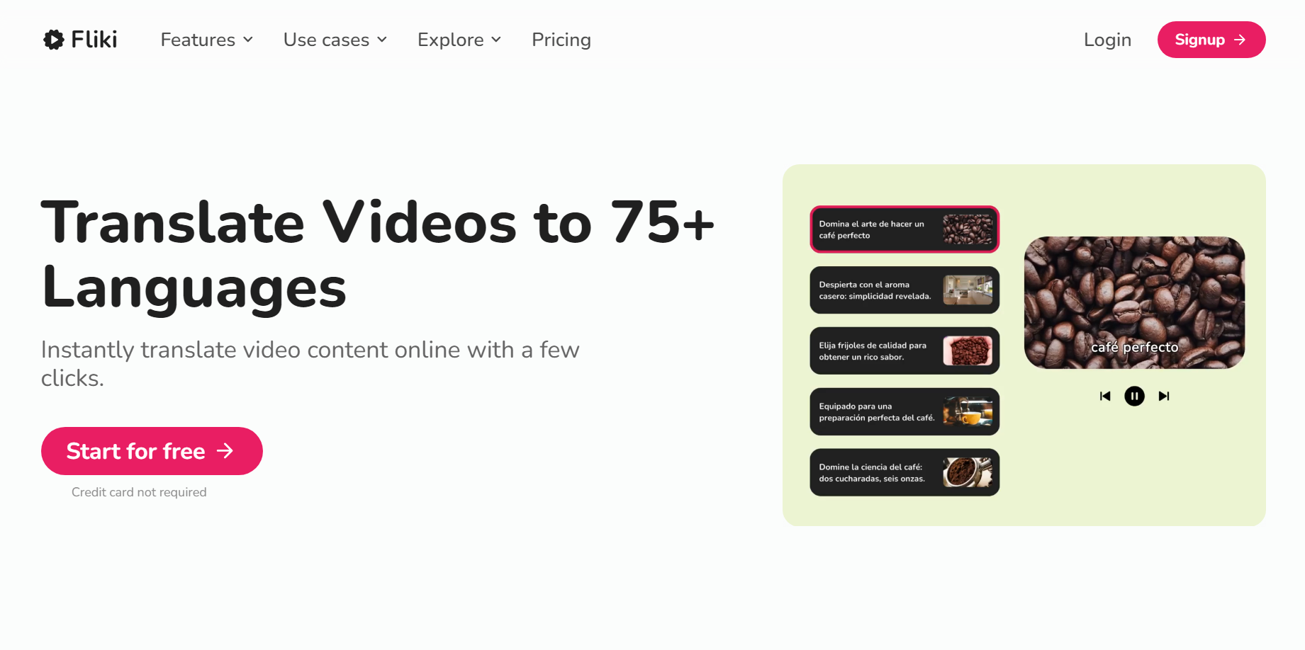 - Massive Voice Library: Enhance your translated videos with Fliki's extensive library of 2,000+ AI voices. Find the perfect match for your video's tone and style.
