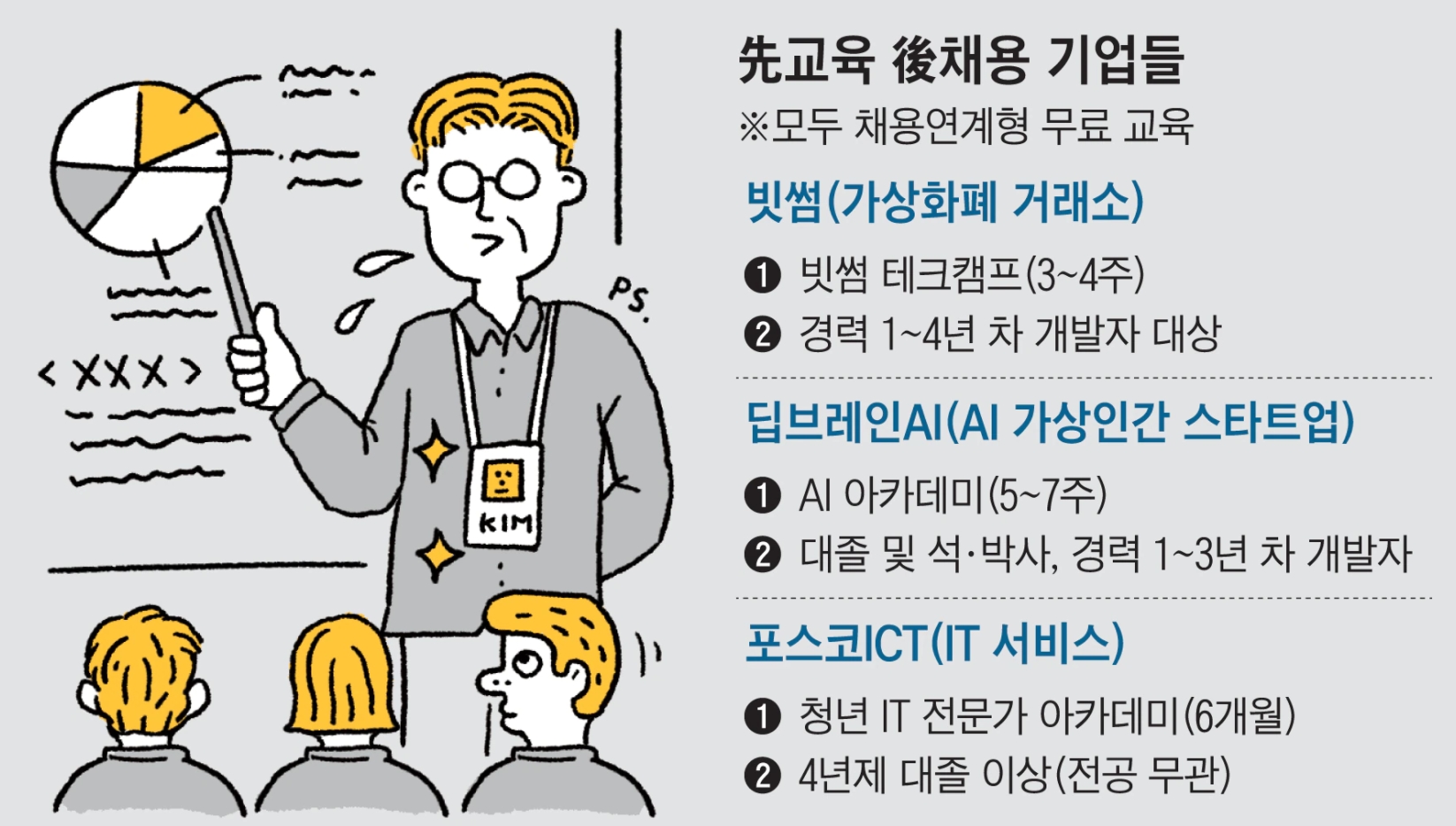 IT(정보기술) 기업들의 채용 풍속도가 달라지고 있다. 과거 ‘시험 봐서 뽑는다’에서 ‘써보고 뽑는다(인턴)’가 됐다가, 이젠 ‘가르쳐서 뽑는다’로 바뀌고 있는 것이다. 대규모 채용을 한 뒤 직무 교육을 하는 것이 과거 방식이었다면, 최근엔 무료로 직무 교육을 시키고 그 안에서 우수자를 선별해 채용하는 식으로 진화(進化)한 것이다.
