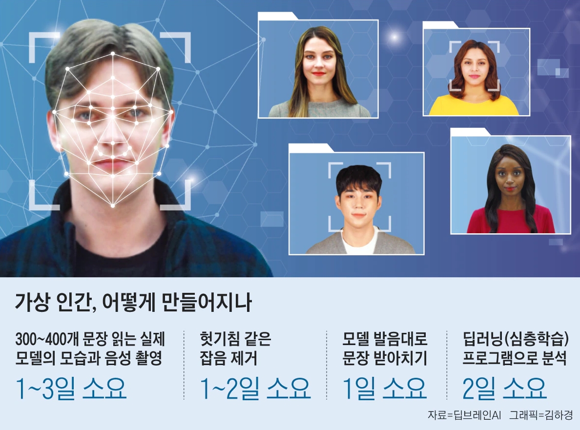 누구나 자신과 똑 닮은 모습의 가상 인간을 만들 수 있는 ‘가상 인간 2.0′ 시대가 성큼 다가오고 있다. AI(인공지능)가 사람의 목소리 톤 변화는 물론 눈·입 주변 근육 수백 개의 움직임까지 세세하게 분석해 구현하는 것이다. 딥브레인AI 장세영 대표는 “기술 발전으로 작년까지만 해도 수십 시간에 걸쳐 1만여 개 문장을 녹음해야 목소리를 구현할 수 있었는데 지금은 300~400개 문장만 녹음해도 충분하다”며 “앞으로는 스튜디오 촬영 없이 집에서 30여 분 녹화하는 것만으로도 자신과 똑같은 모습의 가상 인간을 만들 수 있는 기술을 개발할 예정”이라고 했다.