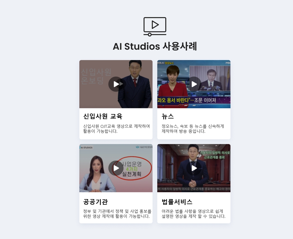 가령 지역 방송국에서는 아나운서를 대신하여 AI 휴먼이 진행하는 뉴스를 제작하고, 학교나 학원 등 교육 기관에서는 교사의 역할을 대신하는 강의 자료를 제작할 수 있는 등 활용 범위가 매우 넓습니다. 현재 AI STUDIOS는 국내에서는 LG이노텍, 광주교육대학교, 경기도교육청, 한국크라우드펀딩협회 등에서 사용하고 있습니다. 해외에서는 미국 자산관리회사 에셋웍스(AssetWorks), 중경방송국, 중국 동영상 플랫폼 윈메이셔(yunmeishe), 중국 부동산 운영그룹 인커 금융(YinTech), 미얀마 한인사회뉴스 애드쇼파르(ADSHOFAR) 등의 기업과 기관에서 사용중입니다.