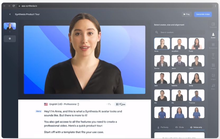 Synthesia.io is an AI-powered video editing platform that specializes in creating and customizing videos with virtual presenters. Using AI technology, Synthesia.io allows you to generate lifelike avatars that can speak and present information on-screen. You can customize the avatar's appearance, voice, and language to match your preferences. This app is particularly useful for creating personalized and engaging video content, such as tutorials, presentations, and marketing videos.