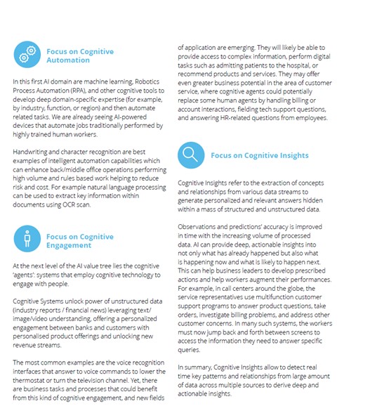 According to Deloitte’s report, “There are three main application areas of artificial intelligence: cognitive automation, cognitive engagement, and cognitive insight.