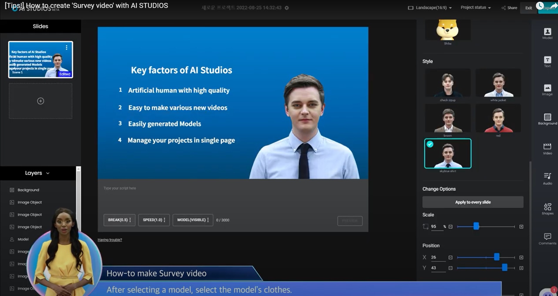 Just by typing the script, this enables the AI anchor to naturally speak, use body language and gestures just like a real presenter.