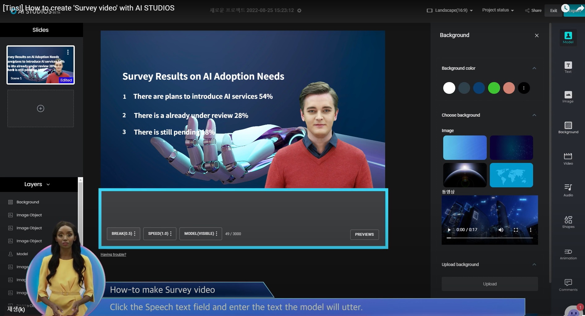By combining DeepBrain’s AI Studios in the form of SaaS and a computer, it’s possible to eliminate costly studio, lighting, camera, set-staff, and even the video host.