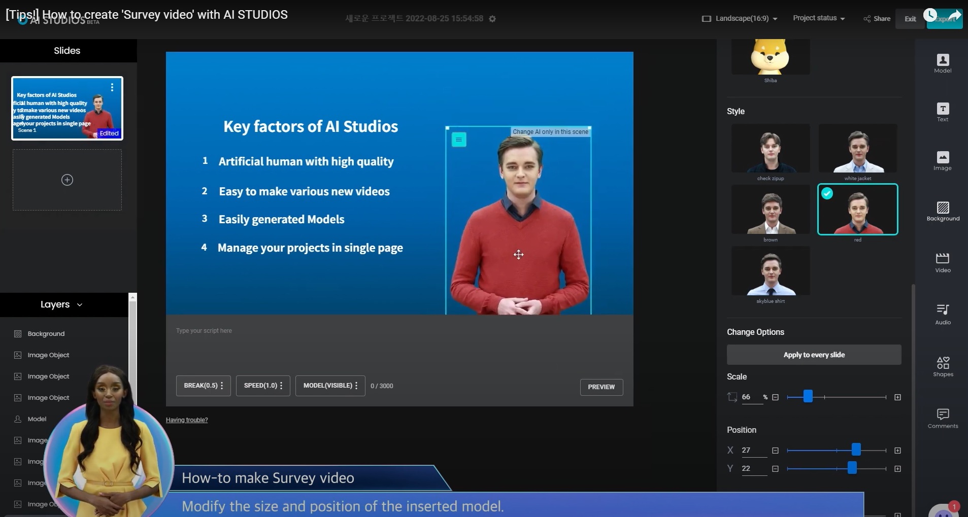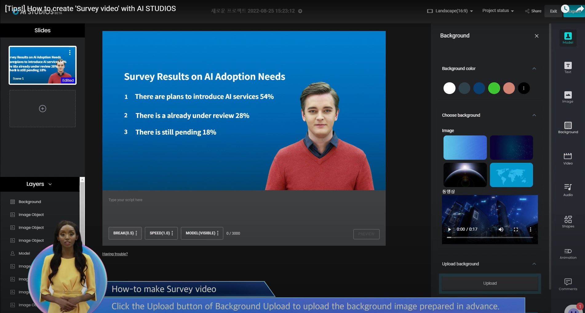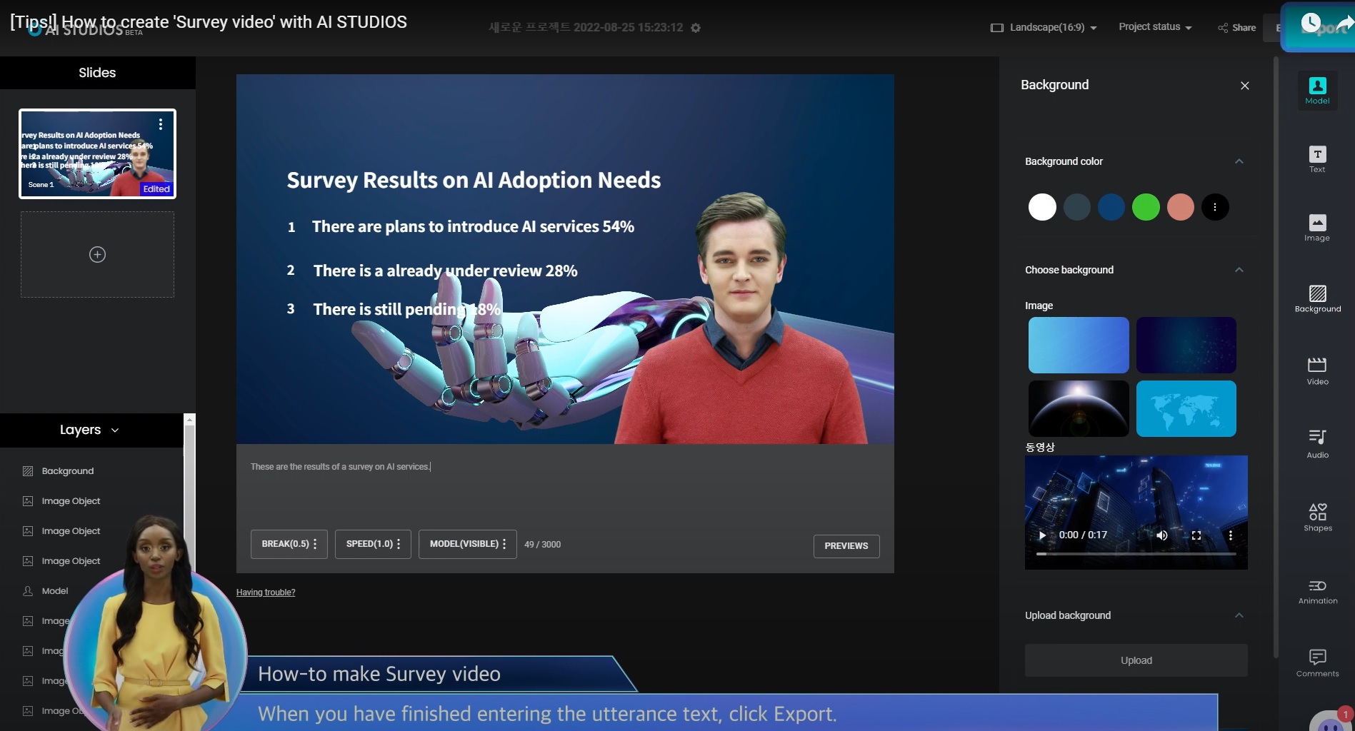 AI Studios allows individuals, and small to medium size businesses to produce content videos for various channels such as YouTube, corporate training and news, and customer demonstrations, all without costly equipment or with the need for deep expertise.