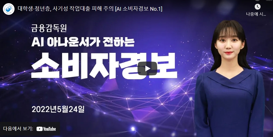 금융감독원은 '소비자경보'를 신속히 전하기 위한 목적으로 AI 아나운서를 영상 제작에 적극 활용하고 있습니다.