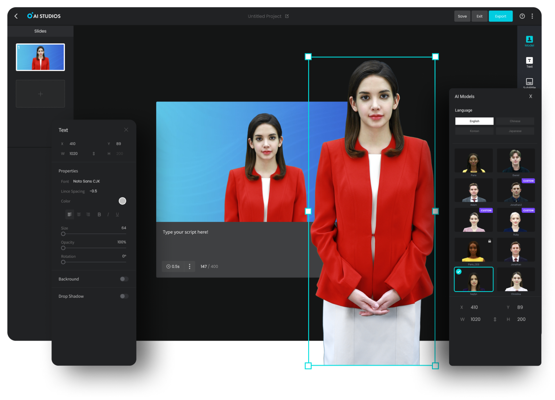 - 40명 이상의 영어, 한국어, 중국어, 일본어 2D 가상 인간 사용 가능